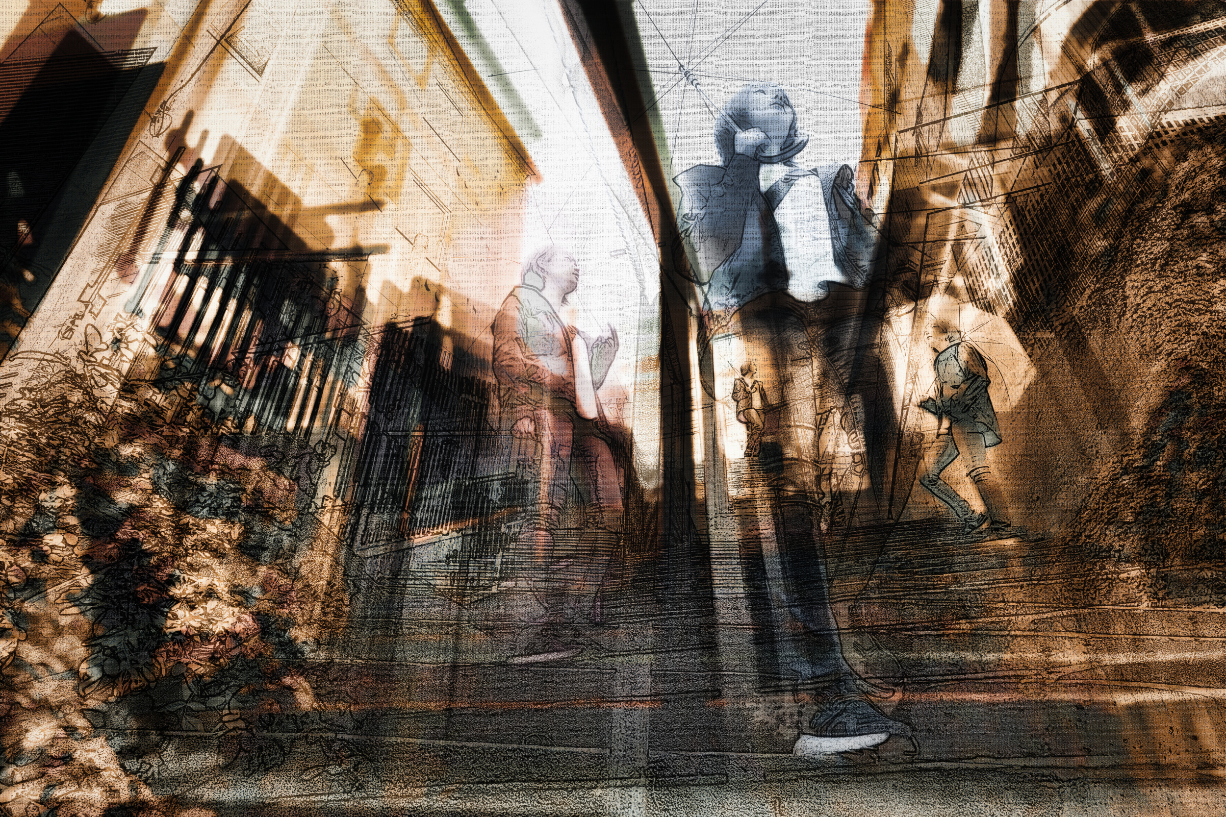 By placing people within these scenes, I can emphasize and direct the narrative while adding geometric intrigue through buildings and structures. My photographic work integrates abstract components to encourage individual interpretation by viewers.  I experiment with out-of-focus effects, different types of blur and combining multiple images to increase the level of abstraction slightly.